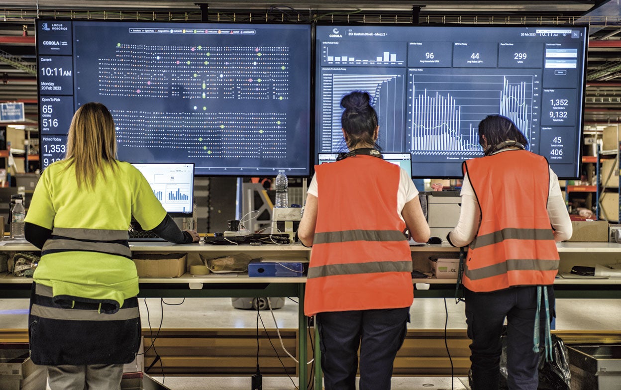 La lógica que impera en el centro logístico de Amazon en Illescas (Toledo) es la del ‘caos ordenado’: los productos no están divididos por categorías (libros, discos, herramientas...), sino que se guardan allá donde hay hueco. Luego el algoritmo se encargará de encontrarlos cuando sea necesario. Así, en un aparente caos, se albergan hasta 19 millones de artículos distribuidos en cuatro plantas (con 180.000 metros cuadrados en total). Aquí trabajan algo más de mil personas y 3.000 robots: ellos mueven las estanterías hasta el trabajador que se encarga de coger los objetos para su empaquetado. Hay otros cuatro centros robotizados de Amazon en España (50 en el mundo).