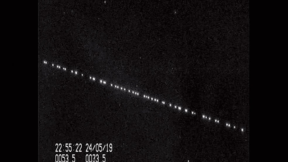 Si miras al cielo durante un rato antes de que amanezca o poco después del anochecer, es probable que veas pasar una hilera de luces. No son ovnis. Se trata de los satélites Starlink del magnate Elon Musk [en la imagen de arriba, según una captura de la página de Internet Satellitemap, que permite ver en tiempo real dónde están]. Los satélites se desplazan en 'bandadas' a unos 500 kilómetros de altura, formando algo parecido a una caravana con decenas de unidades. Cada satélite tiene las dimensiones de una puerta de garaje y pesa unos 230 kilos.