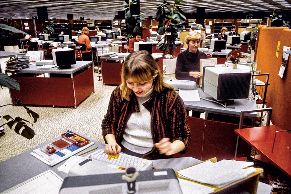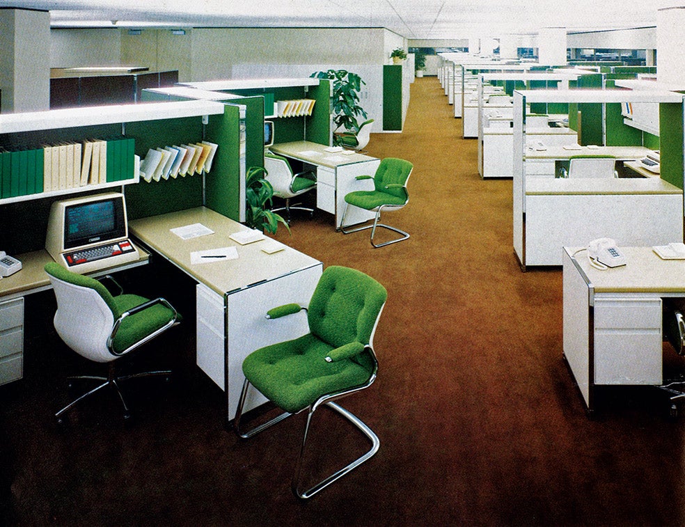 Nada ha transformado y potenciado tanto las oficinas como las computadoras. Con ellas llegaron las fotocopiadoras, el fax, la impresoras... Desde los 80, cada vez más empleados tenían su PC. El mobiliario también cambió para dar soporte energético a a los nuevos dispositivos.