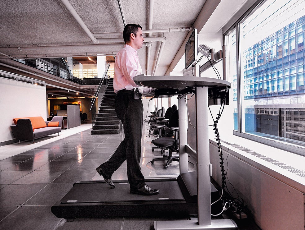 La oficina se ha ido adaptando a la vida y la tecnología, a veces incluso intentando superar sus 'defectos congénitos', como su escasa compatibilidad con un estilo de vida saludable (en la imagen, un empleado trabaja mientras anda sobre una cinta). Pero sigue siendo cuestionada porque dificulta la conciliación del trabajo con la familia, y tiene un importante impacto ambiental derivado de los traslados de trabajadores que implica. De ahí que las palabras de moda ahora en las oficinas sean teletrabajo y flexibilidad.