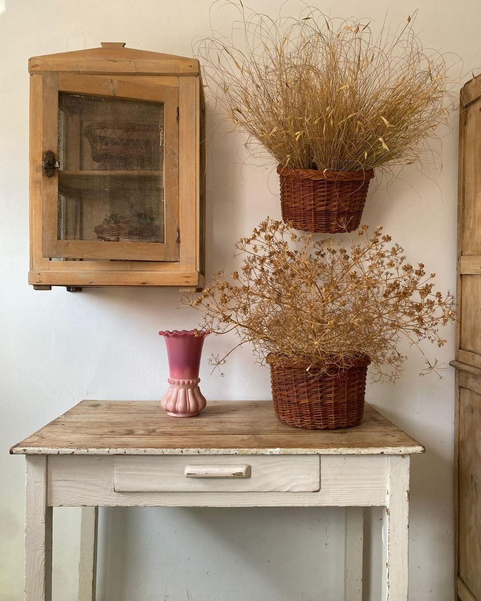 La creadora de La Filomena Mimbre, Pilar Ridruejo, combina sus cestos llenos de esparto e hinojo seco con muebles rústicos. | Pilar Ridruejo