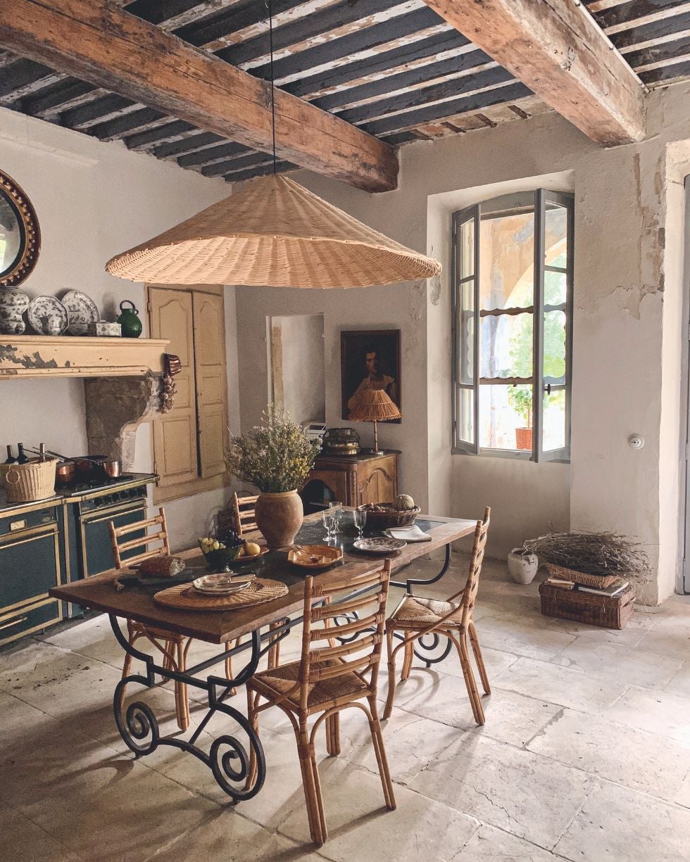 La luz de la Provenza se asoma por los amplios ventanales de la cocina, iluminada de noche por la lámpara Gabriel, de mimbre y ratán natural. | Anthony Watson
