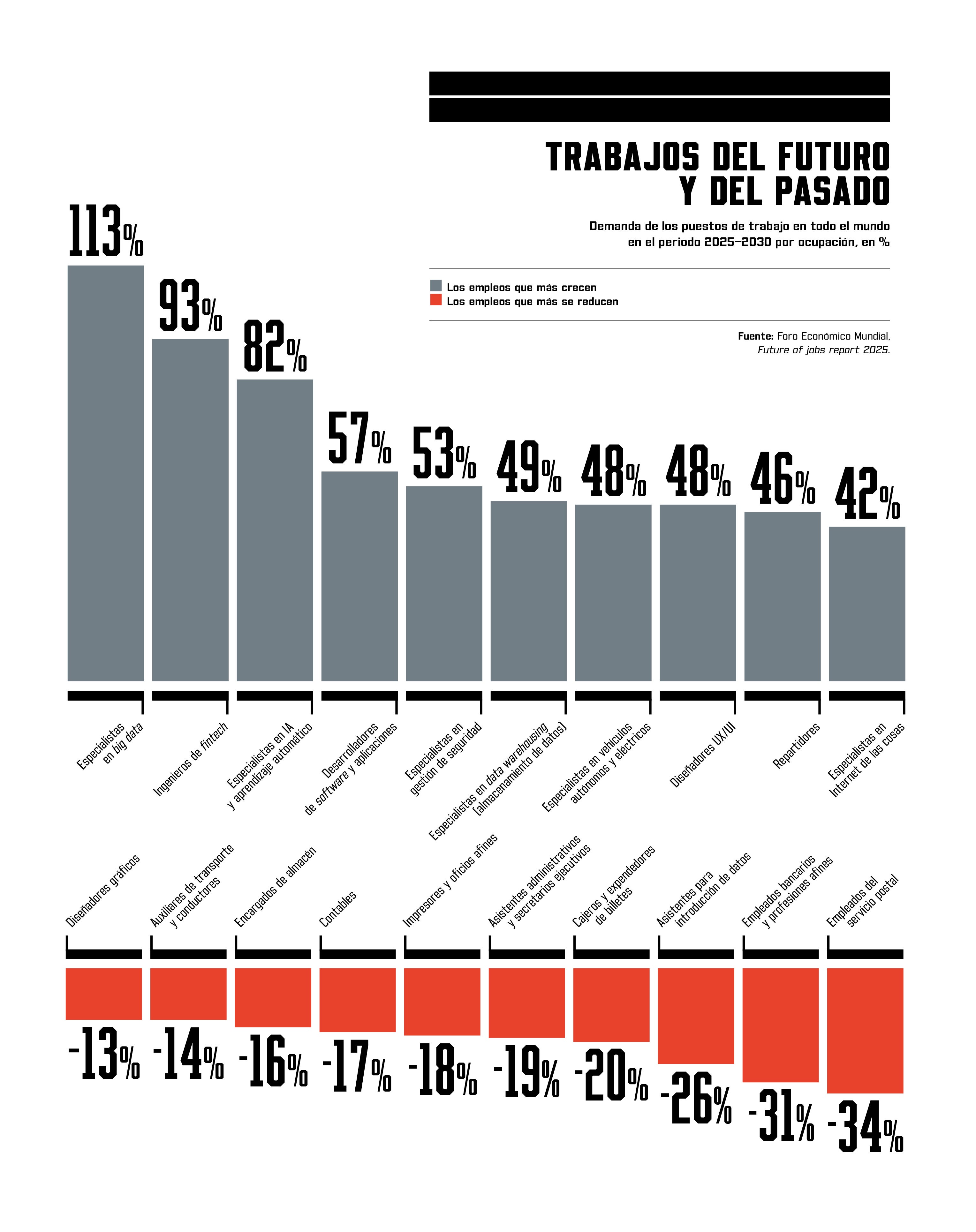 Es una paradoja: nunca se ha necesitado ni desarrollado tanto software en el mundo. Sin embargo, en los últimos dos años, más de una cuarta parte de todos los programadores en Estados Unidos ha desaparecido. Hoy, la administración estadounidense cuenta con menos programadores que en 1980. Solo las tecnológicas ha eliminado cien mil empleos este año: la mayor ola de despidos que la industria haya visto jamás. Si bien se seguirán necesitando programadores, especialmente los llamados 'arquitectos de software' –personas bien formadas y capaces que inventan la estructura cada vez más compleja de los programas–, según Dohmke, la profesión de «pro-gramador júnior» cambiará drásti-camente. La IA es ahora tan común y poderosa que los programadores humanos necesitan un conjunto de habilidades completamente nuevo.