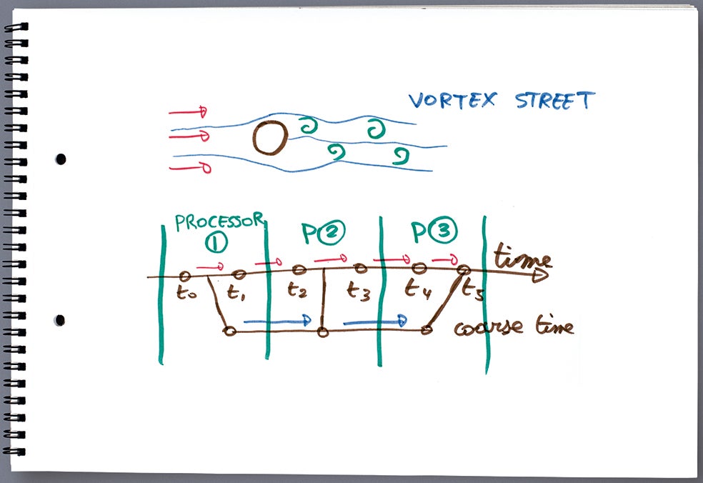 «Arriba he dibujado un problema típico de la dinámica de fluidos: remolinos de agua o de aire que surgen por la presión y que causan vibraciones que pueden afectar a la estructura de un submarino o de una chimenea industrial. Abajo vemos tres máquinas cooperando entre sí para resolverlo. Son tres procesadores conectados y calculando en paralelo, capaces de descomponer un problema grande en partes más pequeñas de manera simultánea para avanzar más rápido. Algunas redes neuronales de inteligencia artificial funcionan así».