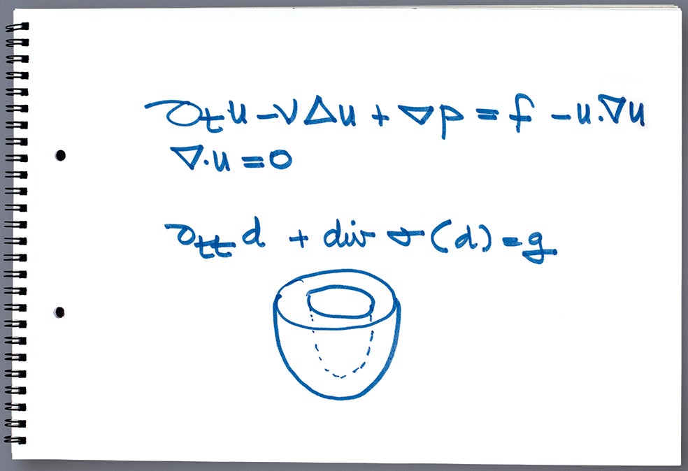 «He dibujado un ventrículo, una cavidad del corazón. Y he escrito dos ecuaciones. una muestra la velocidad y la presión de la sangre en el ventrículo; y la otra, la deformación de sus paredes, hechas de un tejido muscular que llamamos ‘miocardio’. La compresión del miocardio hace que el volumen del ventrículo sea más pequeño, lo que expulsa la sangre hacia la aorta. Entonces se expande y vuelve a entrar sangre».