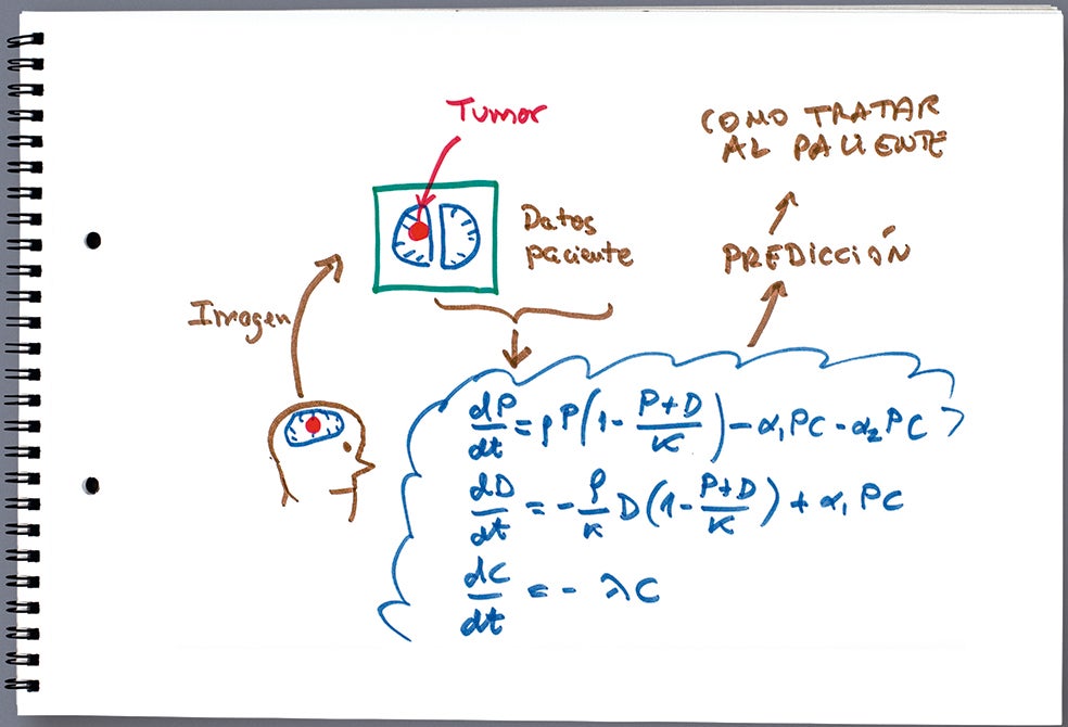 «Tenemos un paciente al que se realiza una prueba de imagen que revela un tumor cerebral. Introducimos en un modelo matemático la información que podemos extraer de esa imagen y otros muchos parámetros. Fabricamos así un clon digital de ese paciente. Y lo sometemos a todos los tratamientos disponibles. Pronosticamos cuál será el más efectivo, calculamos la tasa de supervivencia…».
