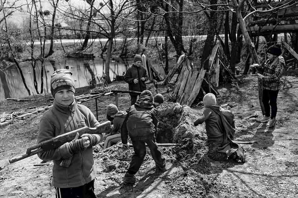 Más de 220 niños han muerto desde el inicio de la invasión rusa, según la Fiscalía de Menores de Ucrania. Los vivos, como estos desplazados, excavan trincheras y juegan en el exterior de una escuela convertida en refugio para familias que llegan, sobre todo, de Mariúpol y el este del país. «Los niños se pasan el día así –cuenta una madre–. Unos hacen de soldados y otros, de prisioneros. Imitan lo que ven».