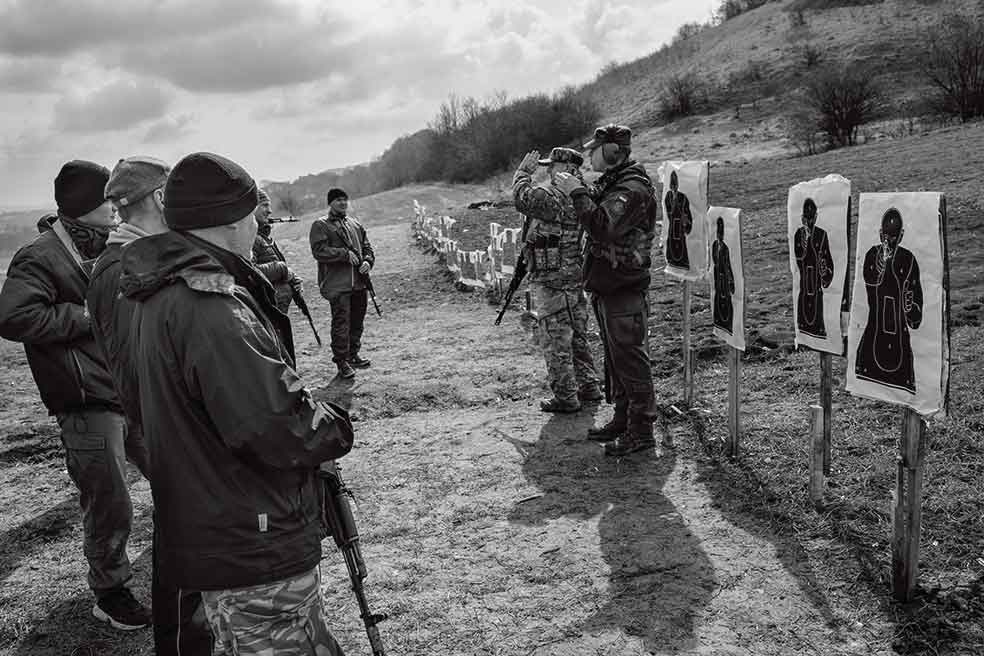 Partisanos se inician en el tiro de precisión y combate. Los entrena Mike, veterano de misiones de paz en los Balcanes y el Congo. «Queda mucho por hacer, pero nadie pensó que fuéramos a aguantar tanto y aquí estamos», dice el instructor. «Se trata de permanecer vivos –añade Alexis, de 50 años, uno de sus reclutas–. Antes cazábamos lobos, jabalíes o ciervos, ahora nos toca buscar infiltrados».
