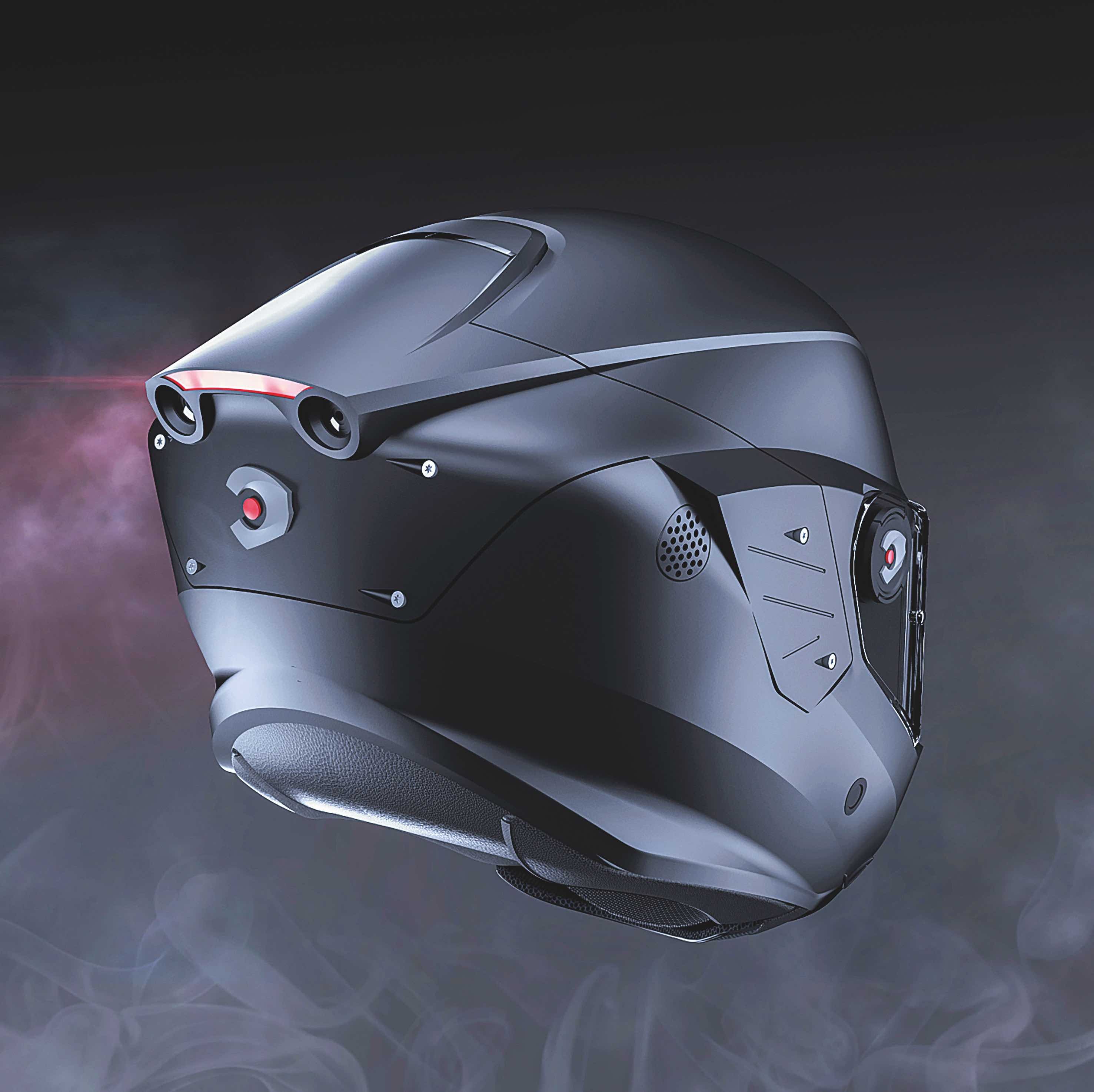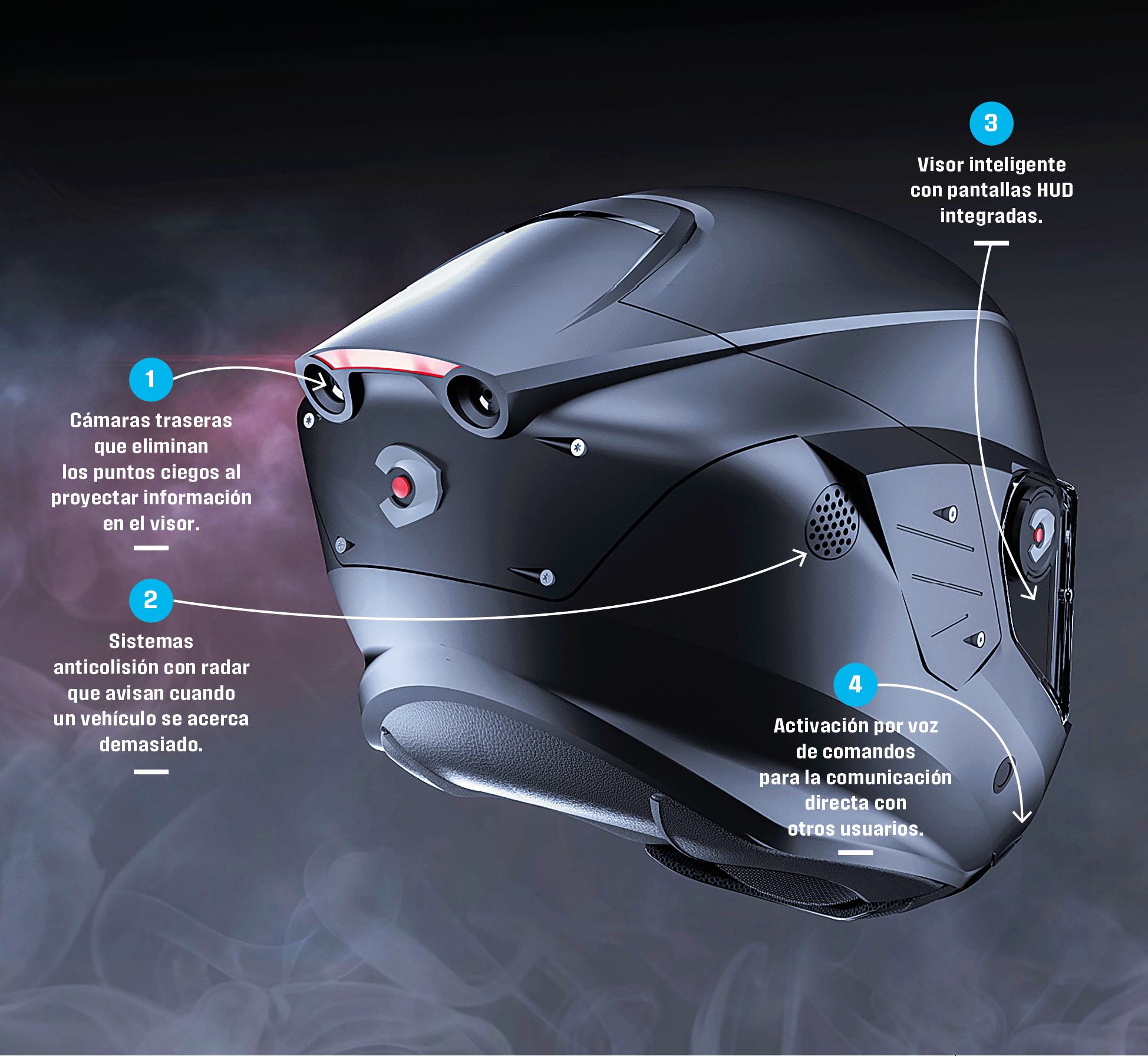 Para motoristas, las innovaciones más recientes combinan cámaras frontales y traseras que eliminan los puntos ciegos; proyectando esta información en pantallas HUD (Head-Up Display) ... integradas en el visor, que muestran datos sin necesidad de apartar la vista de la carretera. Algunos incorporan luces LED traseras que, activadas por acelerómetros, funcionan como luces de freno suplementarias para alertar a otros conductores. Y la próxima generación incluye sistemas anticolisión con radar que activan automáticamente luces de advertencia cuando un vehículo se acerca demasiado, y tecnologías que permiten comunicación simultánea entre decenas de usuarios que se desplazan en grupo.