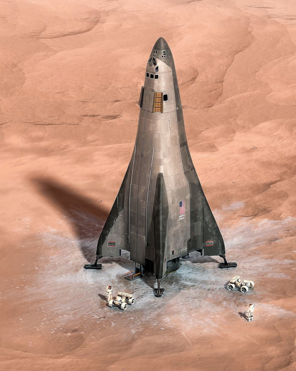 El interés actual por Marte va más allá de la curiosidad científica. El planeta rojo podría esconder una fortuna en minerales estratégicos: de tierras raras imprescindibles para nuestra tecnología a litio para baterías. SpaceX y otras empresas calculan el valor potencial de esos recursos en trillones de dólares. Además, Marte representa la primera frontera para la expansión humana más allá de la Tierra. El planeta rojo podría ser nuestro plan B cósmico, un segundo hogar para la humanidad. En la imagen, una recreación de cómo sería la llegada de un primer viaje tripulado.