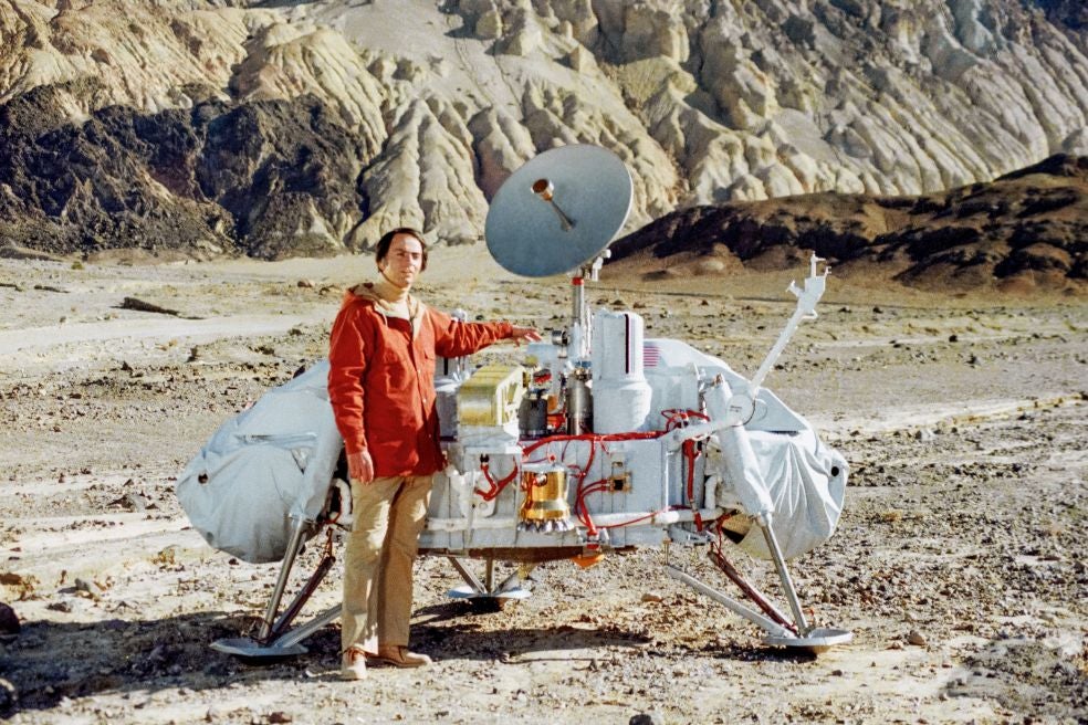 Cada módulo de aterrizaje se prueba antes en desiertos, grandes espacios abiertos para la experimentación con un terreno rocoso similar al del planeta rojo. El astrofísico Carl Sagan posa en el Valle de la Muerte con el módulo de la sonda Viking en 1980. Fue este científico quien descubrió que las variaciones de color de Marte son producidas por el polvo movido por el viento. Su gran legado, sin embargo, fue impulsar la búsqueda de vida extraterrestre y el uso de los radiotelescopios para detectar señales de otros seres por el espacio.
