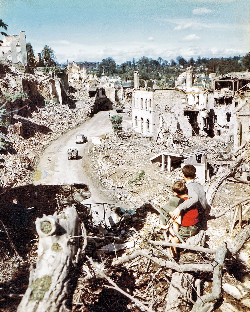 En algunos lugares de Normandía, el bombardeo aliado de cascos urbanos no solo fue evitable, sino que fue contraproducente. Dificultó el avance, sin perjudicar a los alemanes. Saint-Lo en agosto de 1944. Foto: Getty Images (Coloreado de Marina Amaral)