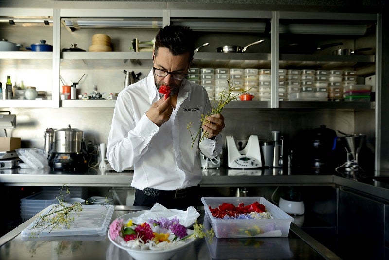 Los pétalos son un ingrediente más en las creaciones de Dacosta. En sus semilleros abundan, por ejemplo, los tagetes, con cuyos pétalos decora platos como las cigalas con nube de vainilla. Suele utilizar un combinado de distintas flores: de saúco, campánulas, pensamientos, de guisante...