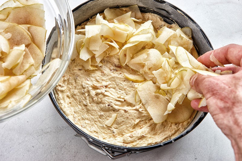 4. Con una mandolina laminamos las manzanas reinetas muy finas. Las colocamos sobre la masa del bizcocho cruda con azúcar y mantequilla. Horneamos durante 35 min. Estará hecha cuando clavemos un palillo y salga seco.