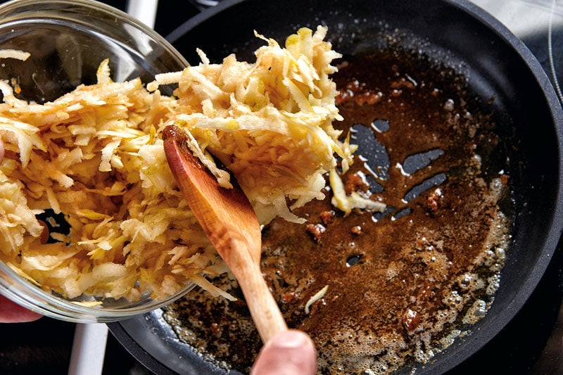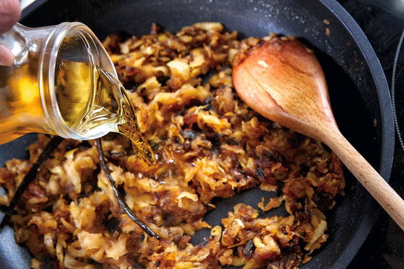 2. Salteamos a fuego fuerte la manzana rallada en ese fondo con las semillas extraídas de rascar la vainilla y ron. La escurrimos y reservamos.