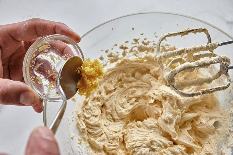 3. Aparte mezclamos el azúcar con la mantequilla e incorporamos los huevos batidos uno a uno; después, la harina, la levadura, la sal y la ralladura de limón. Añadimos la harina a la masa anterior también la manzana salteada y removemos. Metemos la masa en el molde sin que esta sobrepase las tres cuartas partes del molde.