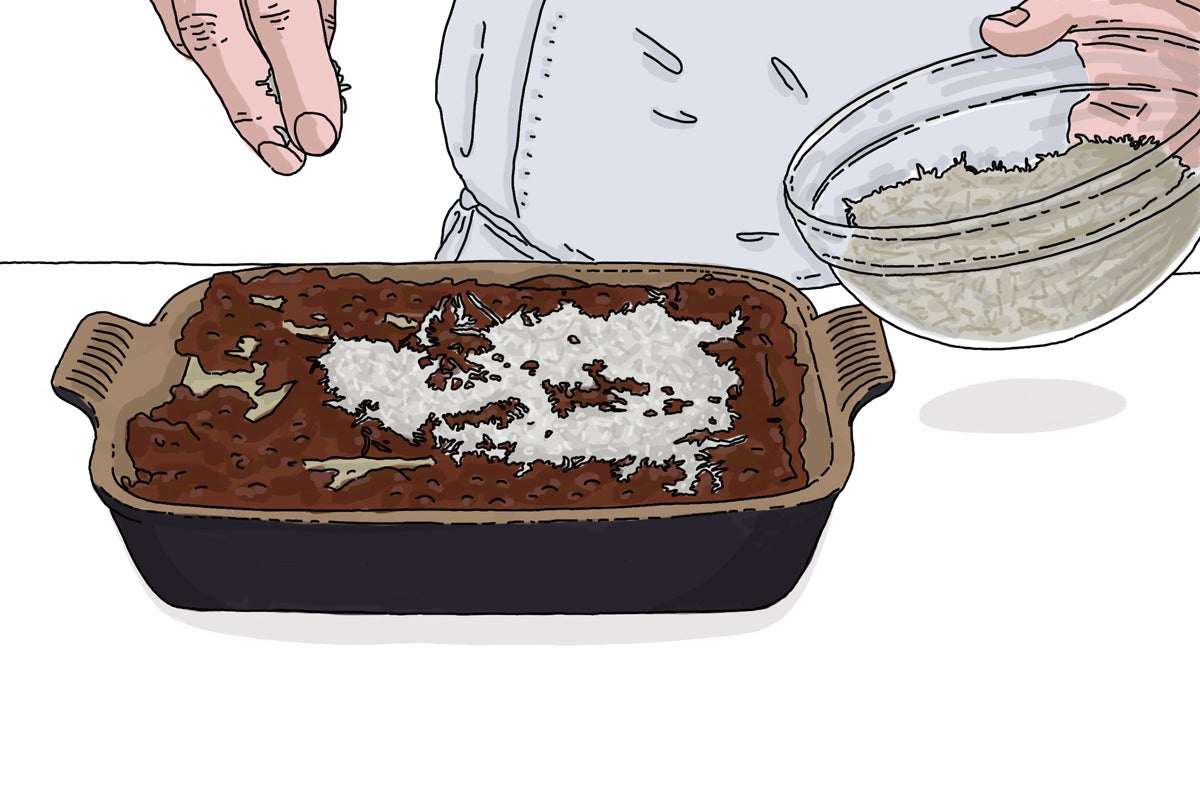 Se espolvorea el parmesano y se hornea 35 minutos. Una vez dorada, se saca la lasaña del horno y se deja reposar antes de comerla.