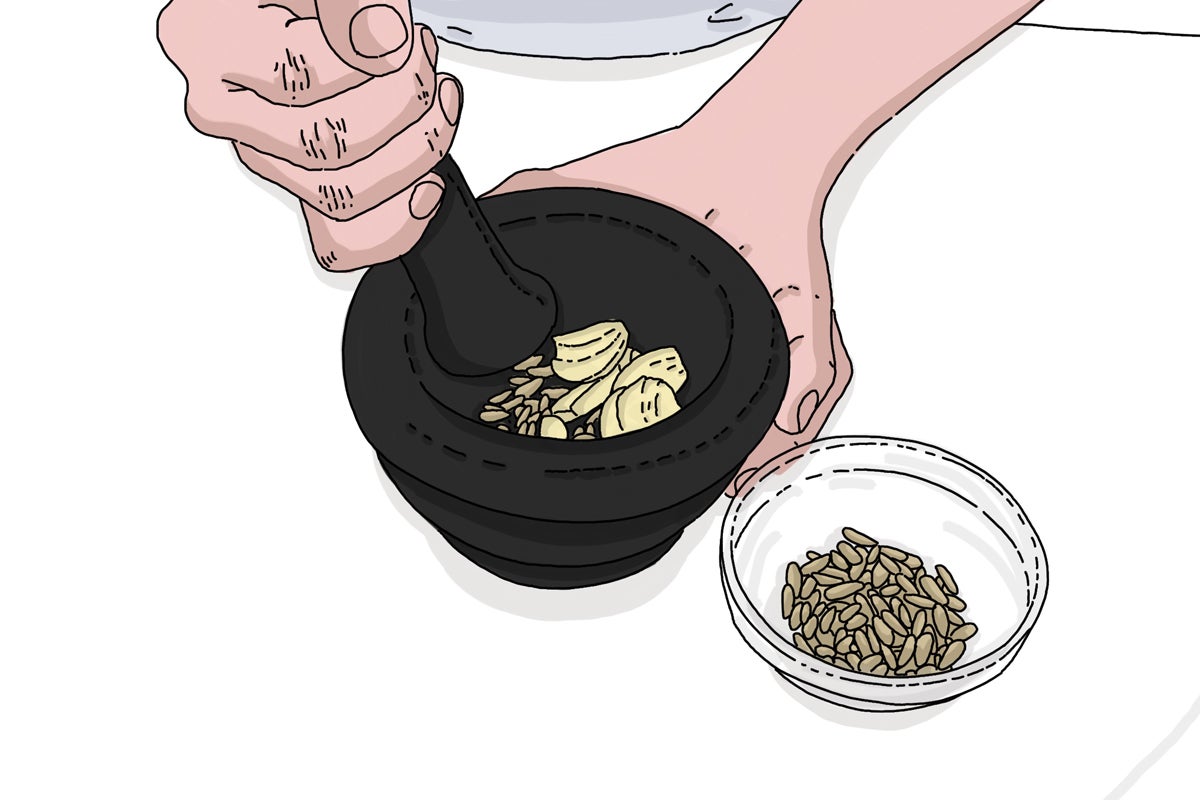 Se majan en un mortero los piñones, los dientes de ajo pelados y una pizca de sal. Se separan los tallos de las hojas de albahaca, se pican y se reservan las hojas.