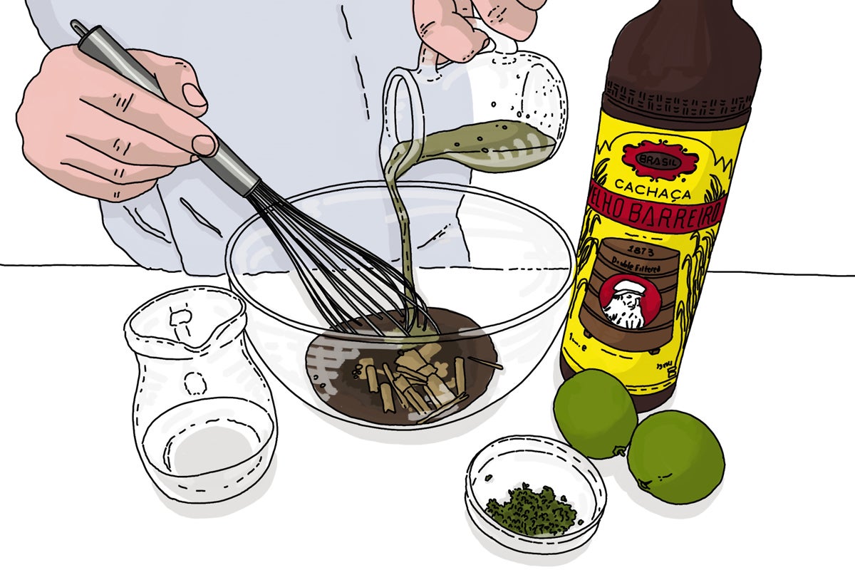 2. Partimos entonces las limas en dos para obtener su zumo, mezclándolo en el mismo bol con el resto del zumo, con la ralladura, el agua, el azúcar moreno, el limoncillo aplastado y la cachaça.