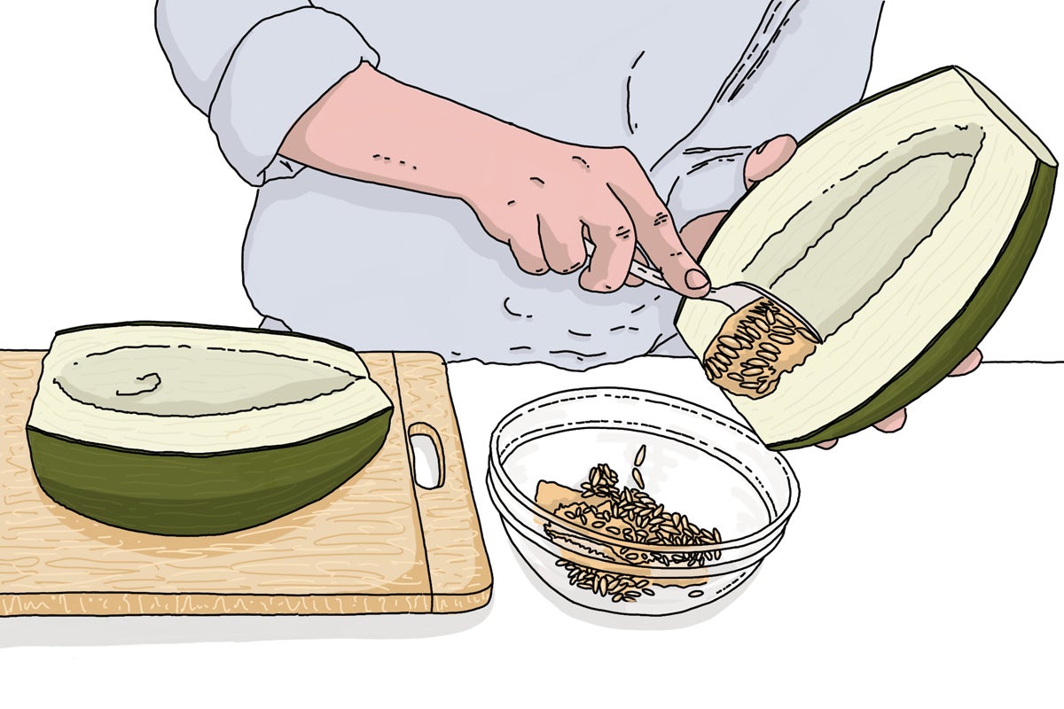 3. Por otro lado, partimos el melón en dos, eliminamos las pepitas con ayuda de un cuchillo y lo pelamos, eliminando toda la piel gruesa y la membrana blanca que recubre la pulpa de la fruta por su interior, para que no queden trazas duras y ásperas.