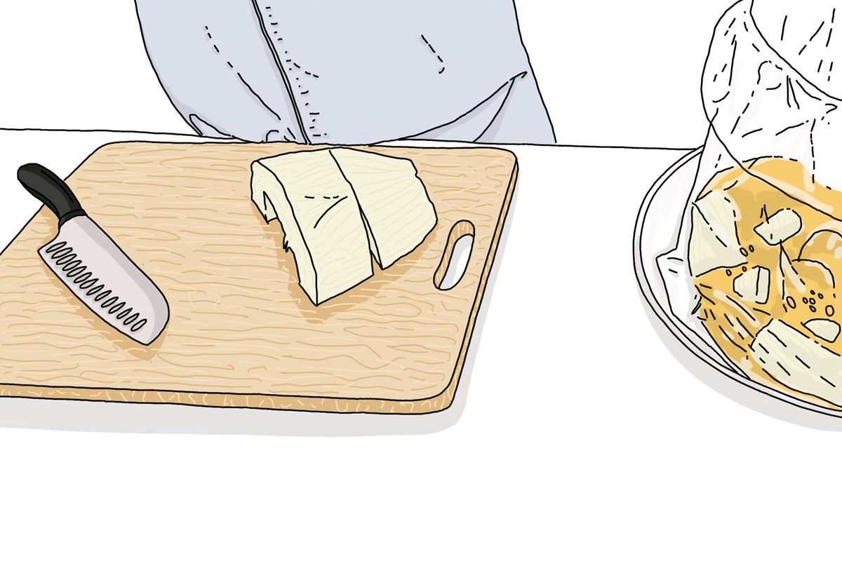 4. Acabado y presentación: con un cuchillo cortamos en pedazos regulares gruesos la pulpa del melón, considerando que es importante que tengan suficiente volumen como para que luego absorban el jugo.