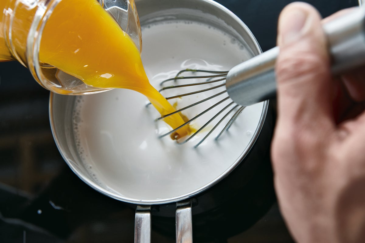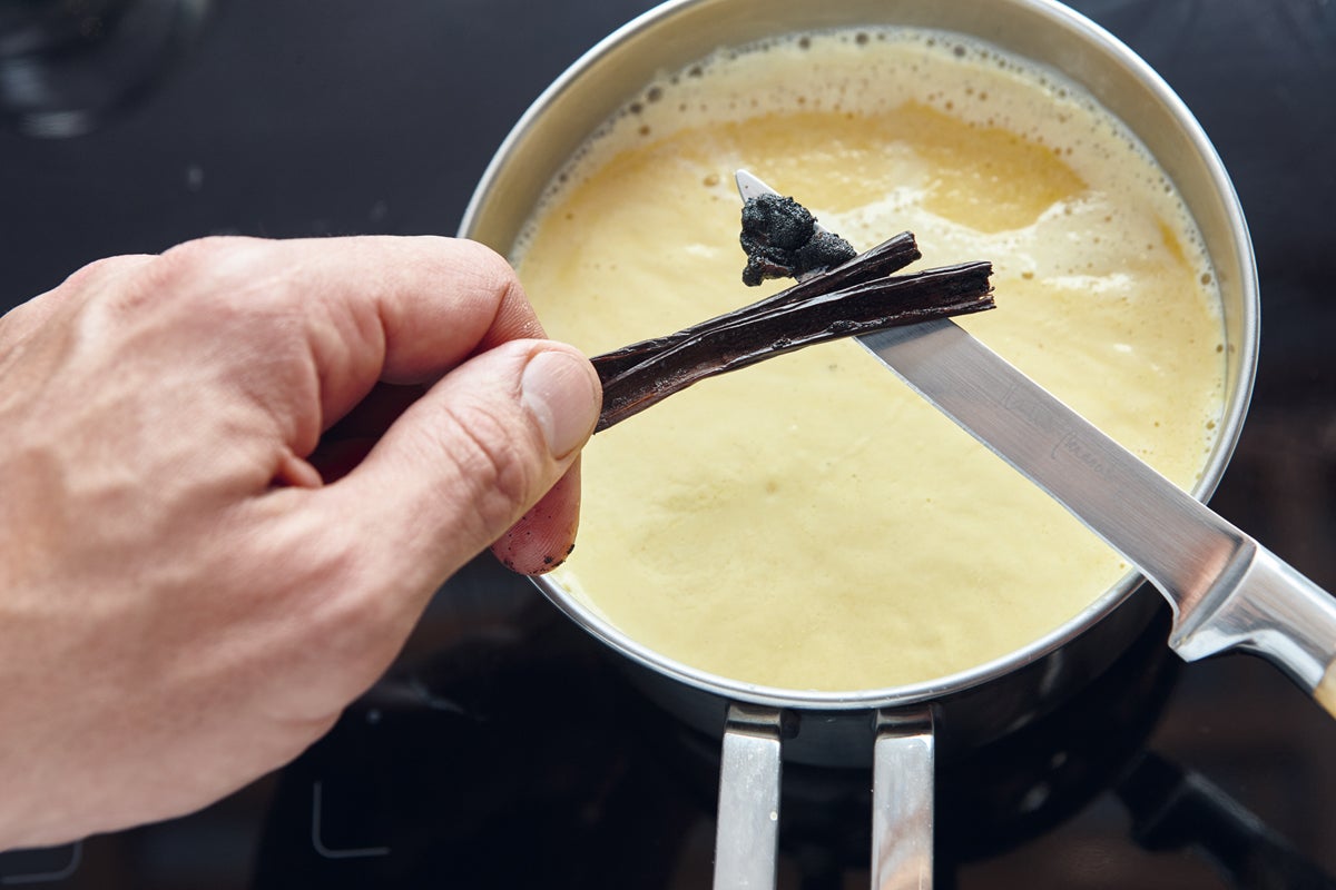 1. Sobre la tabla, con ayuda de un cuchillo bien afilado, cortamos a lo largo la rama de vainilla para poder ... extraer todos los granitos alojados en su interior, que rasparemos con la puntilla. En una cazuela añadimos los granitos y las dos medias ramas de vainilla raspadas, agregando la leche de coco y el jugo de fruta de la pasión.