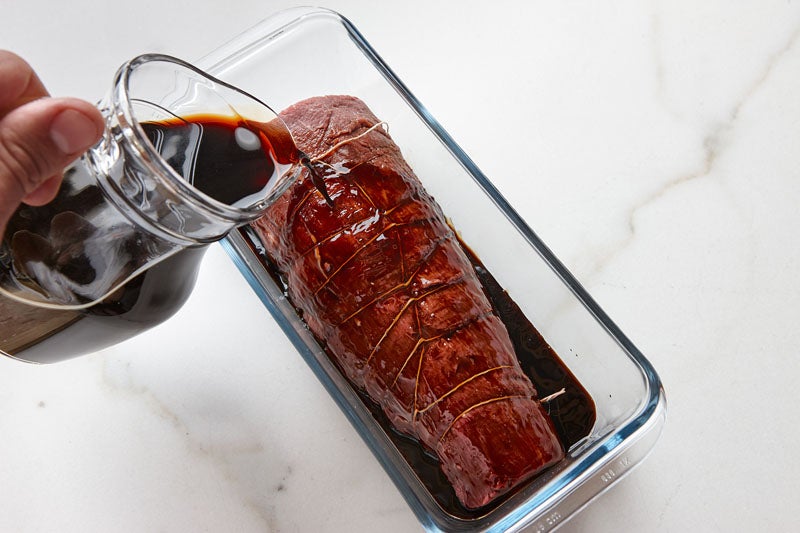 2. Se mete en un recipiente estrecho y se rocía con las salsas de soja y Worcestershire. Se lo deja 'buceando' una hora, dándole vueltas para que se pringue.