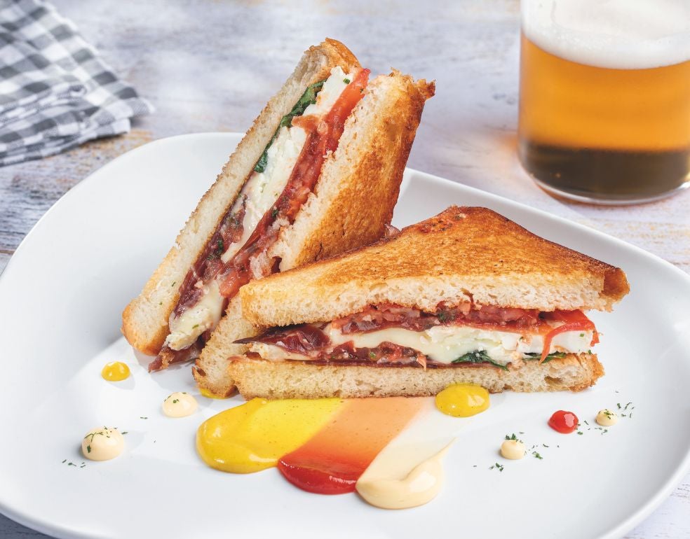 Parte el tomate en rodajas finísimas con ayuda de un cuchillo bien afilado. Mételas en un bol y alíñalas con la chalota, el kétchup, las ... hojas de albahaca rotas con las manos, el vinagre, el aceite y una pizca de sal. Remueve con las manos y deja unos minutos para que macere bien. Unta las rebanadas de pan por sus cuatro caras exteriores con las dos soperas de mantequilla, con generosidad. Por las cuatro caras interiores riega con las dos soperas de AOVE y tapiza la superficie de dos de las rebanadas con las hojas de espinacas, bien extendidas, acomodando las lonchas de paletilla, las lonchas de queso y coronando con las rodajas finas de tomate aliñadas. El jugo del tomate lo podemos usar para empapar los panes, sin excedernos y evitar que se nos deshagan.