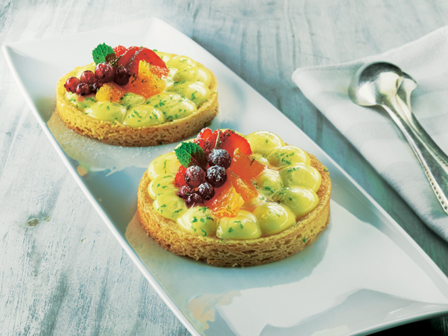 Paso a paso: Exprimimos los limones para obtener unos 150 g de zumo de limón. Hidratamos después la gelatina en agua fría. En una cazuela ... cocemos a 85 C el zumo de limón, el azúcar y los huevos. Retiramos del fuego y agregamos la hoja de gelatina que previamente hemos hidratado y escurrido. Enfriamos rápidamente la crema en un baño maría invertido y, cuando la crema no supere los 45 C, añadimos la mantequilla poco a poco, mezclándola con la crema ayudándonos con una varilla. Colocamos la crema en una manga pastelera con una boquilla y la reservamos en la nevera hasta que la crema esté bien fría. Para la pasta sable: precalentamos el horno a 180 C. Tamizamos la harina y el azúcar glas y las mezclamos con la mantequilla en pomada y con la flor de sal. Sobre un silpat o un papel sulfurizado estiramos entonces la masa, que estará como una pasta, y le damos el tamaño que deseemos con un cortapastas. Retiramos la masa sobrante que nos queda por fuera del molde y horneamos durante 8 min aproximadamente. Se pone la crema, que habremos enfriado antes en la nevera, sobre la pasta sable. Y se coloca también la fruta. ¡Y servimos nuestro postre!