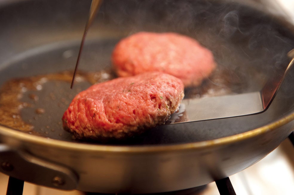 Acabado: para rematar la hamburguesa, se hace la carne en la sartén, vuelta y vuelta, dejándola al punto: roja caliente, rosa o muy hecha, pues ya se sabe que para gustos…