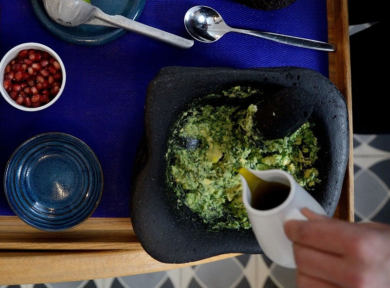 Empezamos poniendo una pizca de sal. Con este truco logramos que el aguacate no resbale por el mortero o molcajete, como lo llamamos en México. ... Al aguacate añadimos una cucharadita de chile serrano bien picado. Añadimos dos medidas de cebolla, bien picada también. Y otras dos cucharaditas de cilantro.