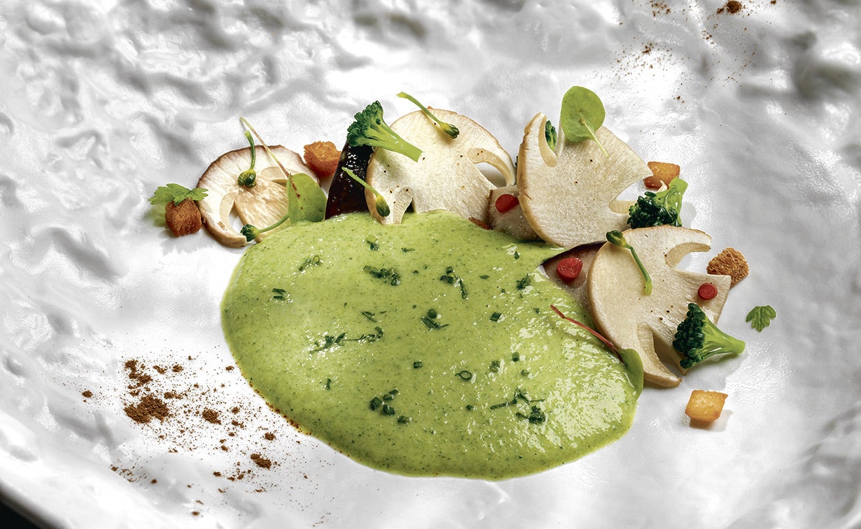 Mete el brócoli escurrido en el vaso de la batidora, vierte el caldo recién hervido y acciona la máxima potencia. Vierte la crema en un cazo a fuego medio y agrega la nata; salpimienta. Fíltrala a través de un colador y rectifica de sazonamiento. Añade la nuez de mantequilla y menea con una varilla o en la túrmix para que emulsione bien. Sírvela con los hongos salteados.