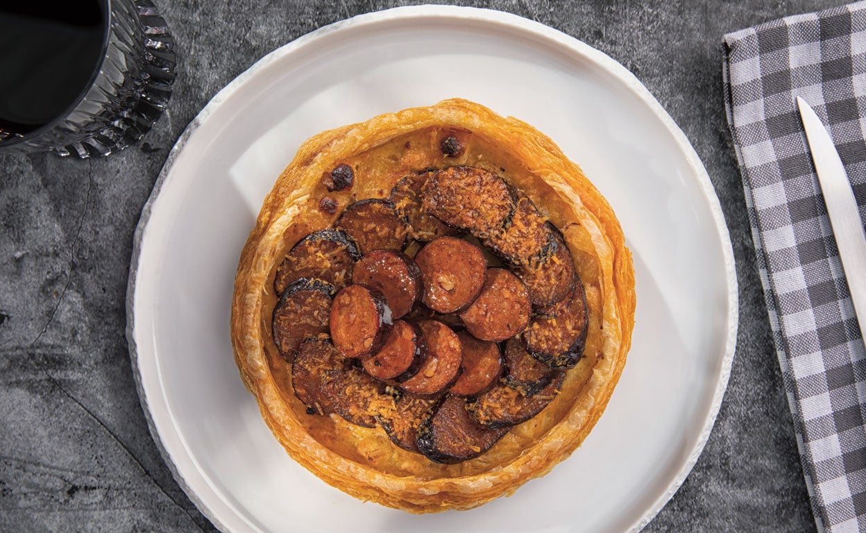 Enlace a la receta: Tarta de cebolla y chorizo al vino tinto