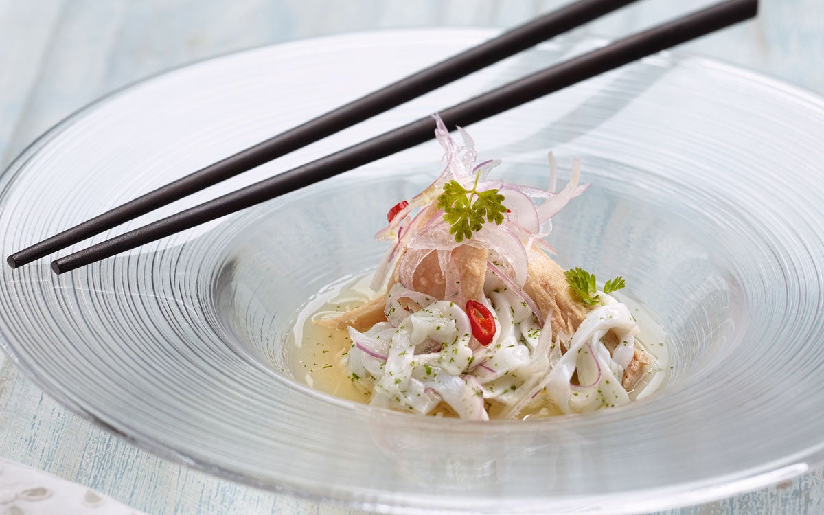 Paso a paso: Se abre el tubo de calamar en dos y se limpia bien, quitándole la telilla que contiene con la ayuda de un ... paño. Se corta muy finamente como si fueran tallarines de unos 2 mm de espesor por 10 cm de largo aproximadamente. Se pueden cortar tanto con una cortadora profesional como con la ayuda de un cuchillo bien afilado. Se pica la cebolla roja en juliana muy fina. En un bol se mezclan los zumos el de naranja, limón y lima con la cebolla roja. Se añaden los tallarines de calamar y una pizca de sal y se dejan marinar durante 2 o 3 minutos. Transcurridos, se sacan y reservan. Se corta el lomo de bonito en conserva en lascas o trozos de bocado. Se emplata el ceviche en el recipiente deseado, preferiblemente de cristal, y se colocan las lascas de bonito por encima, se espolvorea con perejil, se decora con las hojitas de menta y se sirve rápidamente