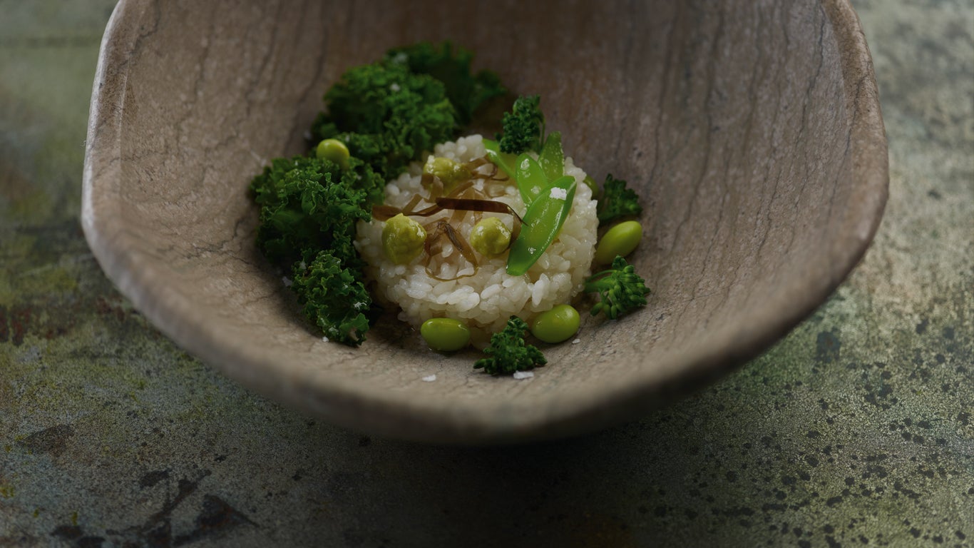 Paso a paso: Se lava el arroz suavemente en un baño de agua fría hasta que el agua salga transparente. Escurrido, se mete en la vaporera de arroz para sushi cubriéndolo medio centímetro por encima con el agua. Una vez hecho, se rompe con el dorso de una cuchara para que se temple y se rocía con el vinagre de arroz, manteniéndolo tibio. Para el aguacate, se bate a máxima potencia la pulpa de aguacate bien maduro junto con el chile, el zumo y la sal. Se va añadiendo el aceite de oliva en hilo fino, por la boca de la batidora, para que vaya emulsionando. Se rectifica de sal y pimienta y se refresca. Para la vinagreta, se calienta ligeramente la miel en el microondas buscando que se funda y se mezcla con el resto de ingredientes, rectificando de sal. Para las verduras, se coloca una olla con abundante agua al fuego y, cuando arranque el hervor, se añade un pellizco de sal. Se hierven por separado, y durante un minuto, las judías, el brécol y las hojas rizadas de col, y se refrescan en un baño de agua helada con sal. Se rehidrata el alga wakame en agua tibia unos minutos, y en el momento en el que esté flexible, se escurre y se corta sobre la tabla en tiras finas, con ayuda de un cuchillo muy afilado. En el fondo de un bol, se coloca una buena cantidad de arroz blanco cocido, bien regado con la vinagreta. Se embadurnan las verduras escurridas con una pizca de aceite de oliva y sal y se posan sobre el arroz, armoniosamente. Y para terminar, se colocan unos puntos de la crema de aguacate, con generosidad, y listo.