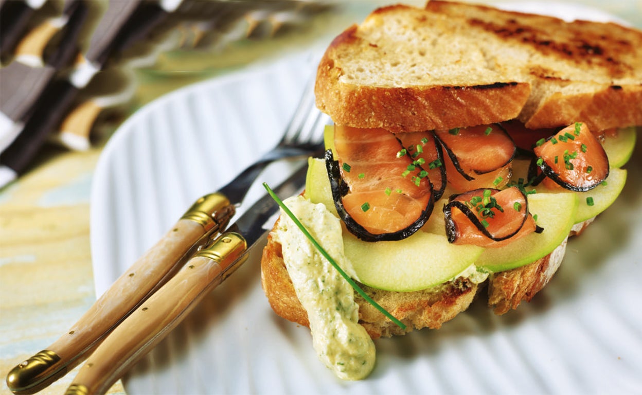 Acabado y presentación. Se unta este queso sobre los medios bollos de pan y sobre él se estiran las lonchas bien finas de salmón ahumado y las láminas de manzana verde. Se cierra el bocata y se esparce por encima un poco de cebollino picado.