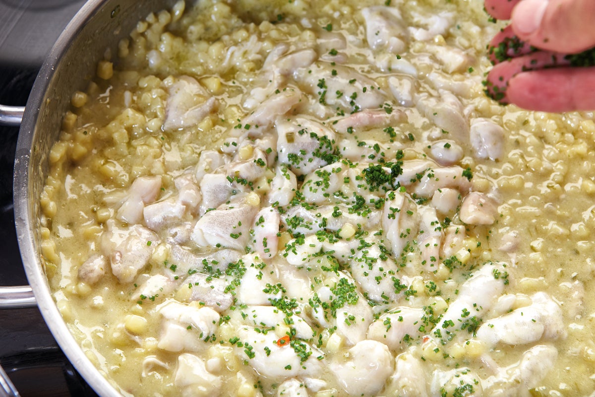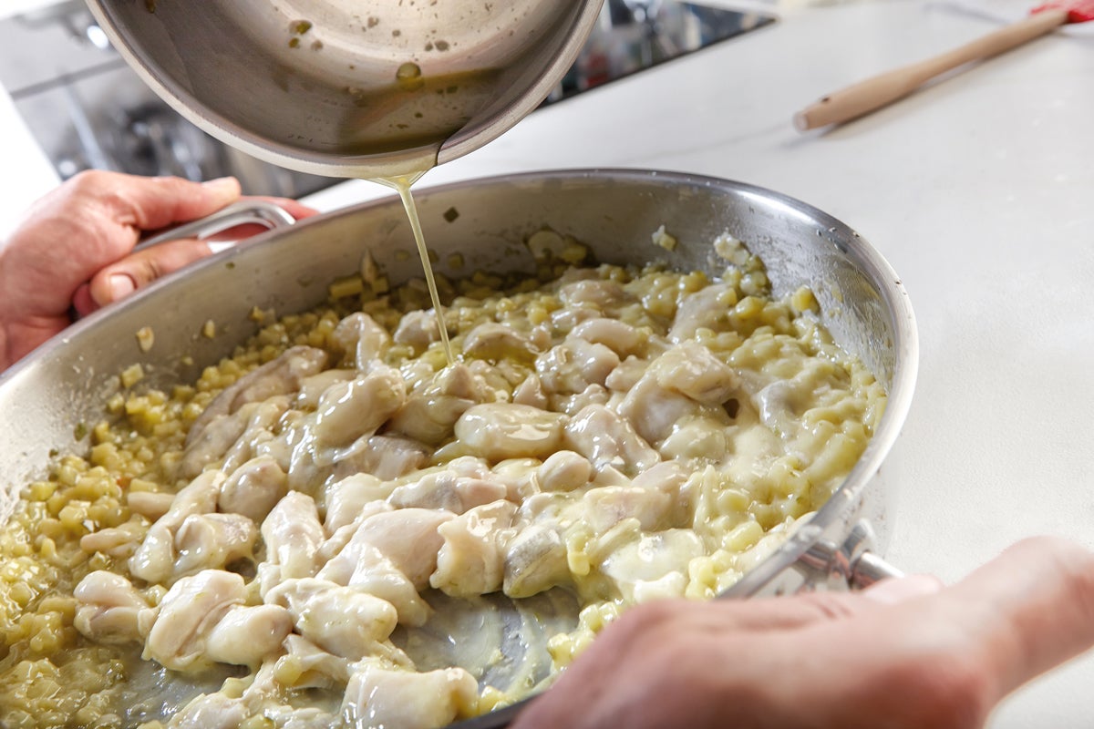 3. Acabado y presentación: una vez transcurridos los 5 minutos, se echa el aceite a otro recipiente para que se enfríe y, una vez que se ha enfriado, se va montando el pilpil, vertiendo el aceite en hilo a la cazuela y haciendo continuos movimientos en vaivén hasta que todo ligue perfectamente.
