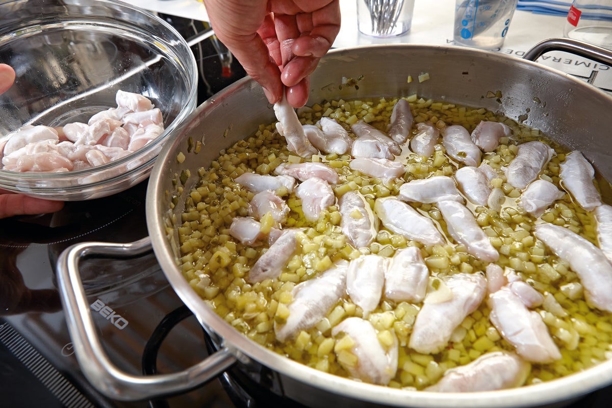 2. ... Se añade la patata cortada en dados de 5 mm y se sigue sudando, moviendo el conjunto con cuidado, durante 8 minutos, a fuego lento y tapado, hasta que todo esté hecho. Una vez bien pochadas la verdura y la patata, se agrega la guindilla fresca, sin pepitas. Se echa también el aceite de oliva y, cuando haya tomado temperatura, se colocan encima las cocochas cortadas por la mitad. Se cuece tapado durante 5 minutos.