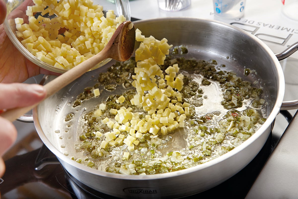 Se añade la patata cortada en dados de 5 mm y se sigue sudando, moviendo el conjunto con cuidado, durante 8 minutos, a fuego lento y tapado, hasta que todo esté hecho... Una vez bien pochadas la verdura y la patata, se agrega la guindilla fresca, sin pepitas. Se echa también el aceite de oliva y, cuando haya tomado temperatura, se colocan encima las cocochas