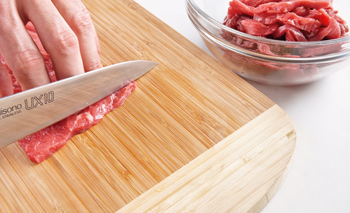 Para empezar con nuestra receta de ensalada de rulos de jamón, se corta la carne de ternera tierna en bastones de uno por seis centímetros.