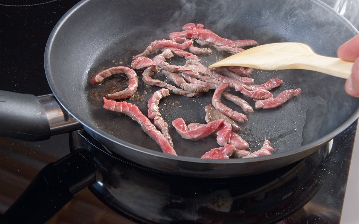 Para saltear la carne, se debe elegir una sartén adecuada. grande para que quepa toda sin que se amontone, pero no tanto como para que queden superficies vacías, ya que se quemaría el aceite y se saldrían los jugos.