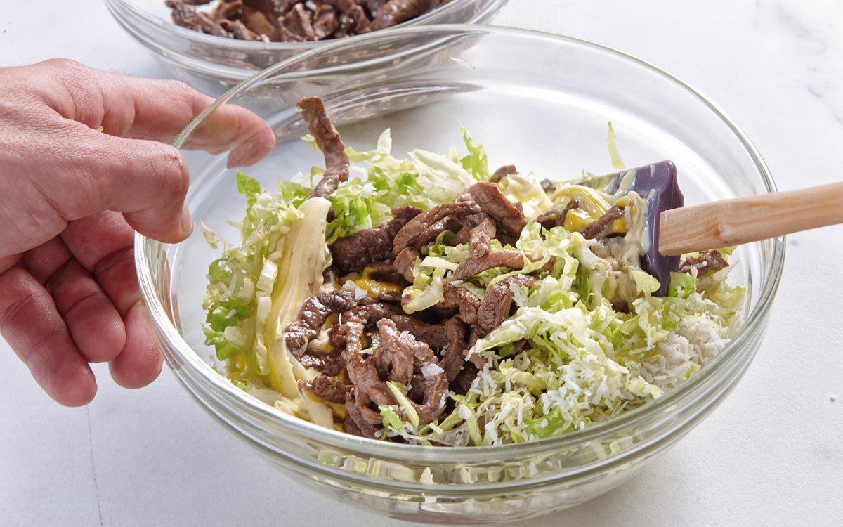 Se mezcla la carne con la lechuga, la mostaza, la mayonesa y el Idiazábal.