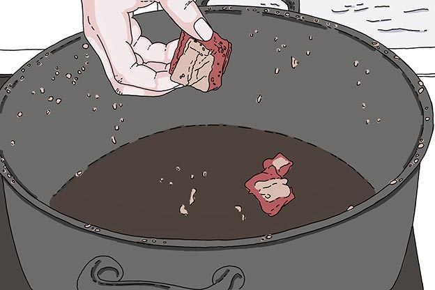 Devuelve al fondo la carne guisada, la panceta rustida y los hongos que tenías apartados, dejando que arranque el hervor y manteniendo el borbotón suave por espacio de unos 15 minutos más, para que