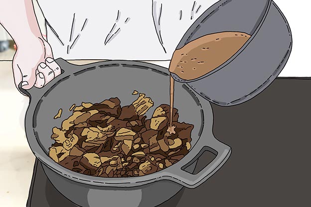 En vez de tuétano de vaca podemos emplear una nuez de mantequilla para conseguir el mismo efecto de salsa melosa y brillante. Unas gotas de brandy sobre la salsa, justo antes de servir, le darán a la cazuela un toque singular.
