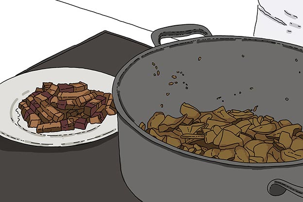 En una olla dora la panceta con la mantequilla sofriendo a fuego muy suave los lardones hasta conseguir que queden rustidos. Entonces escúrrelos a un plato y, en la misma grasa del fondo, tuesta los hongos laminados hasta que suelten su jugo y se cocinen poco a poco. Sazónalos ligeramente y, una vez que estén en su punto, retíralos y ponlos con los lardones.
