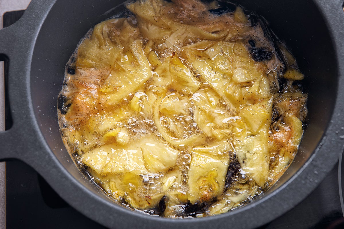 Se cuece la piña con azúcar, vainilla y zumo de limón a fuego lento (20 min).