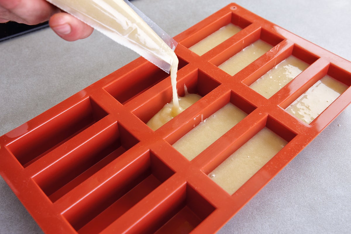 De las magdalenas: se funde la mantequilla y ... se deja enfriar un poco. Se mezclan en un bol la harina, el polvo de almendra, la levadura y el azúcar en polvo, todo ello tamizado. Se rompen las claras con la ayuda de una varilla y se agregan a la mezcla de secos. Se añaden la mantequilla y la miel y se remueve. Se mete al refrigerador para que coja cuerpo durante 6 horas. Se reparte en moldes y se meten al horno a 200 C durante 13 minutos. Se dejan enfriar un poco, se desmoldan y se colocan sobre una rejilla para que se enfríen a temperatura ambiente.