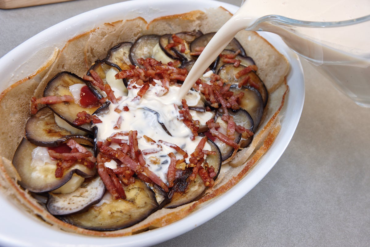 Se incorpora la mezcla de huevos, leche y nata y se hornea media hora, con cuidado de que no se dore mucho.