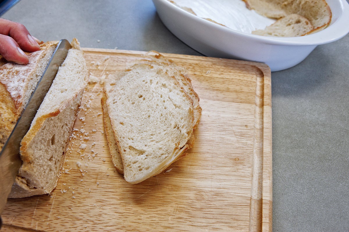 Para empezar con la receta de pastel de berenjena y queso de cabra, se corta el pan en láminas finas para cubrir la base y las paredes del molde.