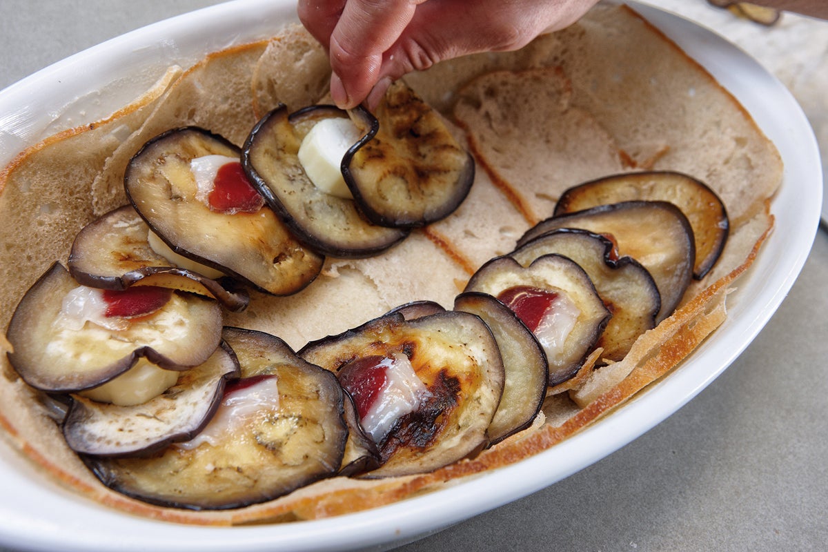 Se cubre con las rodajas de berenjena doradas en aceite de oliva y el queso.